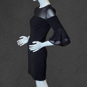 Gorgeous black evening dress by AIDAN MATTOX. Fitted at the waist to accentuate your figure. Sheer top & a beautiful sheer bell sleeve. Falls just above the knee. Lined from breast down. Finished with lace on the inside hem. This dress would be perfect for a black tie dinner, wedding guest, ceremony or any semi formal event.