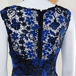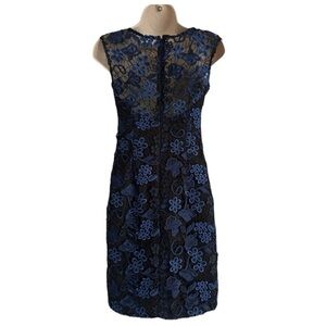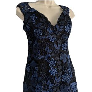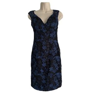 AIDAN MATTOX Blue Black Elegant Floral Appliqué Deep V Sheath Party Dress Sz 0