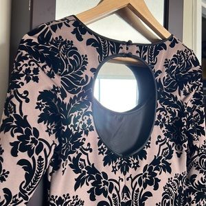 ELBOW LENGHT SLEEVE CUT-OUT AT BACK BACK ZIP CLOSURE BUTTON CLOSURE AT BACK OF THE NECK VELVET FLORAL MEASUREMENT TAKEN LAYING FLAT: UNDERARMS: 17", WAIST: 14", HIPS: 18", LENGTH: 37"