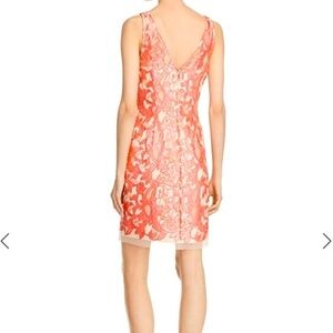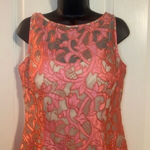 Beautifully sophisticated and feminine sleeveless dress perfect for any occasion. Fully lined with a peachy apricot pink embroidered lace overlay on a cream tulle mesh. High rounded neckline. Plunging v-back with a hidden zipper. Formed boning lining inside bust.