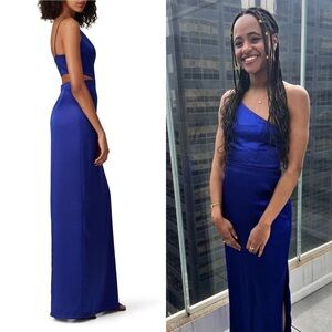 AIDAN MATTOX Royal Blue Satin One Shoulder Cutout Back Sleeveless Maxi Gown 4