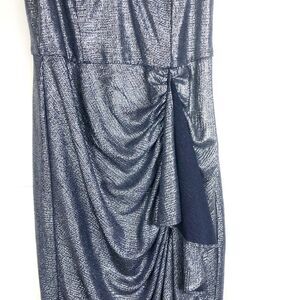 AIDAN MATTOX Silver Shimmer Navy Waterfall Draped High Low Midi V Neck Dress 0