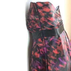 Dramatic black red & pink contemporary floral pattern taffeta with a black organza overlay makes this formal strapless dress a real knockout