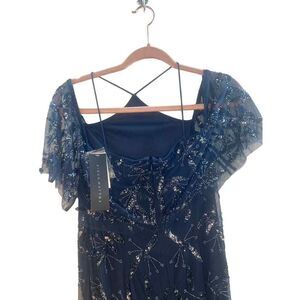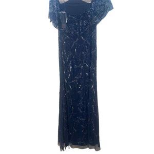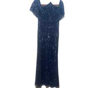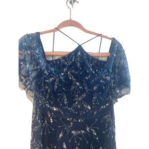 AIDAN MATTOX WOMENS 10 BLUE SQUINE OFF THE SHOULDER MAXI BALL GOWN BACK ZIP