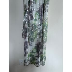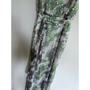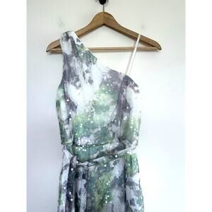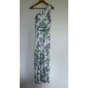 AIDAN MATTOX green purple white one shoulder full sequin maxi long dress - built in waist tie sash - slit at thigh - clear sequins throughout - blouson style - fully lined
