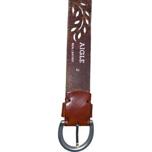 AIGLE Brown Perforated Laser Cut Floral Real Leather Silver Buckle Belt