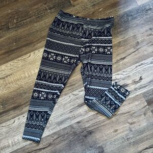 Cozy gray hooded long sleeve top paired with black and white patterned leggings. Top is v-neck. Rounded hemline. Soft cotton/polyester fabric. Bottoms have elastic stretch waistband. Polyester/spandex fabric. In great preowned condition. A&I The top is a size XL & the bottoms a size large.