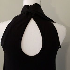 Shift dress, high off the shoulders, 3 button back of neck band. Dramatic key hole back with silk tie. Very soft and comfortable. Can fit a size 2 and a size 0.