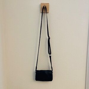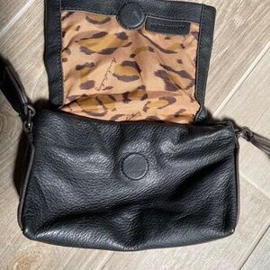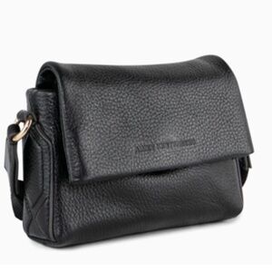 AIMEE KESTENBERG Leather Broadway Mini Crossbody Bag. A buttery black leather bag that features an adjustable sporty nylon shoulder strap for hi-lo styling. Magnetic flap-and-snap closure, hidden entry under flap, interior slip pocket and lined interior. Measurements: 5”H x 7”W x 2”D. Condition: Excellent. Body and interior is clean; no marks tears or stains.Stored with care in a non-smoking, no pet environment.
