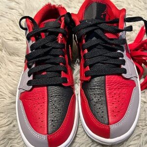 Air Jordan 1 Low SE Split- Gym Red/Cement Grey- Black Sneaker. Only worn once however puppy got a hold of the right shoe (see pics). Heel a bit chewed up on Right side. Can be covered with jeans or wide leg sweat pants. Super cute shoes. Didn’t want to let go but I normally wear tights or shorts so it would be noticeable. Box and red shoe strings included. Originally paid $110. Asking $55. Will consider offers.