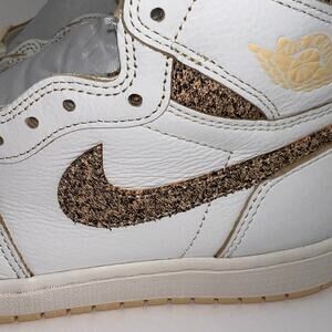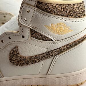 The Air Jordan 1 Retro High OG Craft ‘Vibrations of Naija’ presents a subtle colorway of MJ's first signature shoe. Off-white tumbled leather is utilized on the upper, accented with a Pale Vanilla Swoosh covered in black speckling. The identical finish is applied to the high-cut collar, wrapped in ankle flaps branded with a Wings logo on the lateral side. A woven Nike Air tag embellishes the breathable nylon tongue. The high-top is mounted on a durable rubber cupsole, featuring off-white sidewalls and a cream-colored outsole.