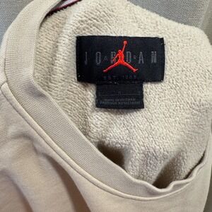Step into vintage vibes with this classic Jordan crewneck sweatshirt. A stylish and comfortable piece, this sweatshirt boasts a soft, cozy feel, perfect for everyday wear. The timeless beige colorway is complemented by the embroidered 'JORDAN' logo, featuring a unique plaid pattern, adding a touch of retro flair. Classic crew neckline, ribbed cuffs, and hem complete this timeless style. The iconic Jordan logo is subtly embroidered on the sleeve, nodding to the brand's heritage.