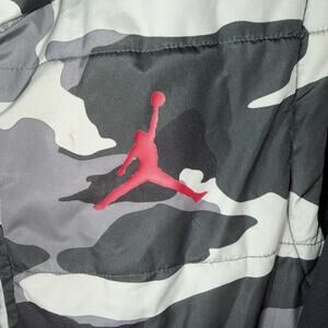 This Air Jordan boys XL camo hooded puffer vest jacket is a stylish and functional outerwear option for young boys. Made from polyester with a black gray and white camouflage pattern, it features a Michael Jordan over sized logo on the long sleeves, and a full zip closure. The vest also includes a hood, pockets, and insulation for added warmth, making it suitable for travel, activewear, and casual occasions during the winter, fall, and spring seasons. With its Michael Jordan character and colorful theme, this jacket combines practicality with a touch of iconic style from the Jordan brand.