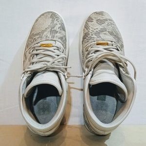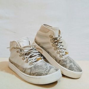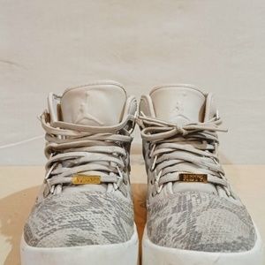 Here we have a Men's basketball shoes from Air Jordan, size 8.5. Color is Cream, Camo and material is Leather, Suede.
