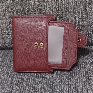 This maroon, compact wallet from AIRKIT measures 5" x 3.75" x 1.25". Crafted from premium leather, it features an exterior slip-in pocket, 8 RFID-blocking card slots, 4 clear ID windows (2 detachable), 1 zippered coin pocket, and a full-length bill compartment