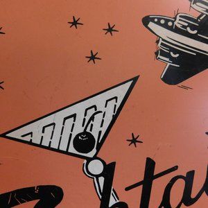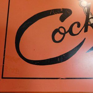 Front is peach/pink (?) color with a plane, cocktail glass and logos - glare from light makes sign look orange - great retro looking sign