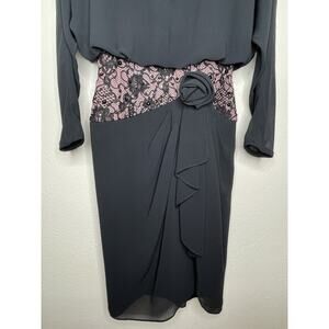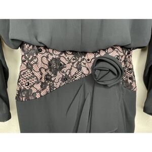 Gorgeous black crepe chiffon A.J. Bari evening dress from the 1980's in a 1940s style. Strong shoulder on a blouse like top with a keyhole front that buttons at the neckline. The back of the dress is open to the waist for a peek a boo effect with buttons from the back neckline to the waist. The waist is fitted. The dress hipline has a pink fabric covered in floral lace and black and clear rhinestone details. There is a rosette detail in front. The front of the skirt is gathered at the front for a draped effect. The skirt falls just below the knee. This dress is semi sheer and has areas that are double layered but it is unlined.