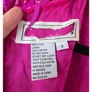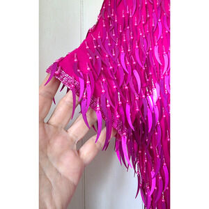 A.J. Bari Silk Hot Pink Cattail Sequin Beaded Fringe Vintage Trophy Sheath Dress - it's a size 6 (in vintage, could be smaller in current sizing - see measurements) and in good pre-owned condition. Some random loose strings but there are so many embellishments that it's really hard to see, they can easily be cut off, though. Also, a small snag on the inner lining where the zipper must have gotten stuck, can hardly see it. No idea why the brand name was cut out but the RN# suggests it's this brand. Colors vary by monitor but I'd say it's like a hot pink/fuschia color. Perfect for a Taylor Swift concert!