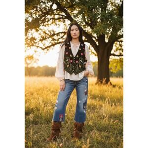 This stunning vintage vest by AJ is the ultimate coastal cowgirl or western-core statement piece. With intricate floral embroidery and luxe suede texture, it’s a timeless layering staple with bold personality.