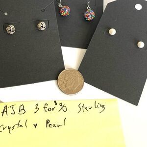AJB Beautiful Sterling 925 Silver earrings 3 for $30. We work hard to find high quality fine jewelry for our buyers. This item is sourced from an estate sale and the former owner had exquisite tastes. The great craftsmanship make this item a true work of art and with its pristine condition It is truly A great value of fine jewelry at costume pricing! Let’s make it yours!
