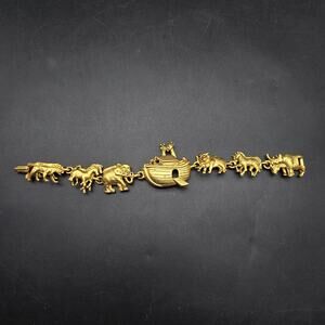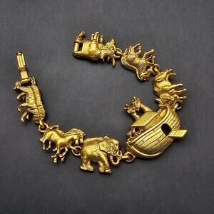 This vintage ACJ bracelet features gold tone Noah's Ark theme links and measures 7" L and is marked AJC on the back of the bracelet