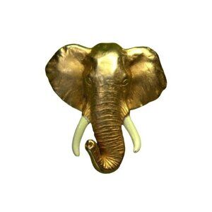 AJC Signed Vintage Elephant Brooch. This is an 1980's circa Hard to Find and Rare Brooch. Ever increasingly more difficult to find, especially with tusks that are not marred. Gold tone AJC intricately designed elephant head brooch. This incredibly detailed pin is so lifelike and is very rare to find in gold. Note the enameled ivory toned tusks. Materials: gold tone metal, enamel paint, secure roll over clasp bar, signed AJC. Measures 2 1/8"L X 2 "W. Signed AJC. Perfect condition.