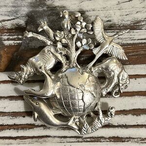 AJC Vintage Brooch Multiple Animals Around the World Earth Planet Silver Tone