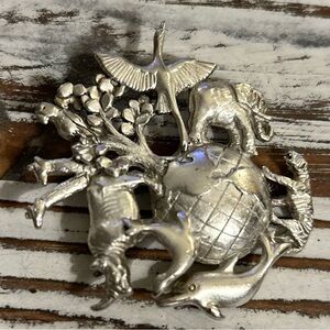 AJC Vintage Brooch Multiple Animals Around the World Earth Planet Silver Tone