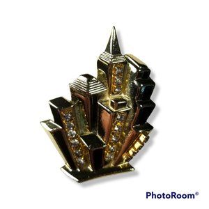 AJC Vintage City Scape Building Brooch Pin Enamel and Rhinestone RARE