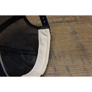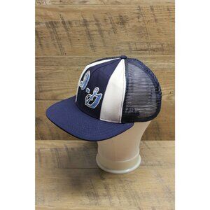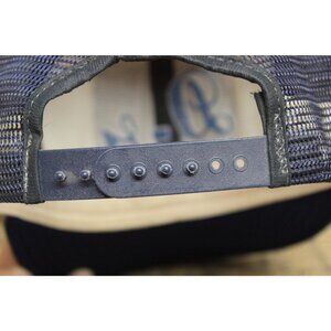 Vintage AJD ( made in USA) Lucky Stripes snapback hat in double knit, and mesh construction with chain stitch detailing on front ( initials appear to be D-J) in size Large.