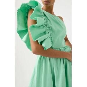 AJE Bonjour Asymmetrical Green One Shoulder Ruffle Mini Dress XS, AU6/US2