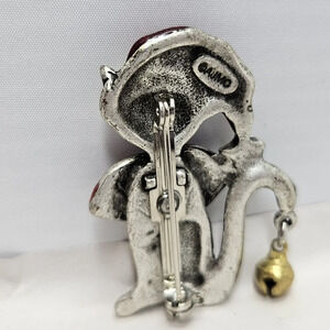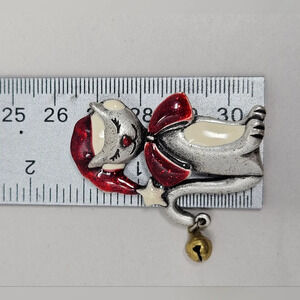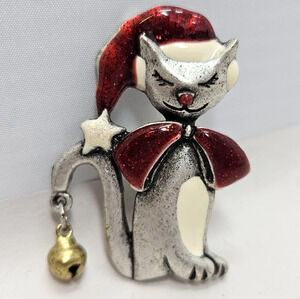 AJMO Cat Pin Brooch Pewter Enamal Wearing Santa Hat Bell & Bow 1.5 inches