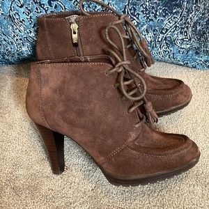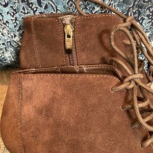 Beautiful side zip bootie with gold AK zipper pull; genuine leather (suede) with lace up front and tassels. Worn once; in excellent as new condition. Small .25 inch platform - 3.5 inch heel. Size 7.