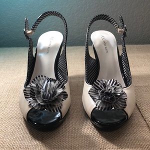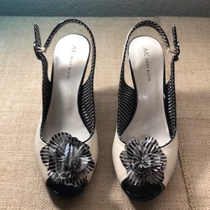 AK Anne Klein Akeli Ivory & black peep toe slingback heel. Ivory boys with black piping. Black & black/white striped flower toe jewels. Slingback has adjustable buckle. Sole is tread-less.