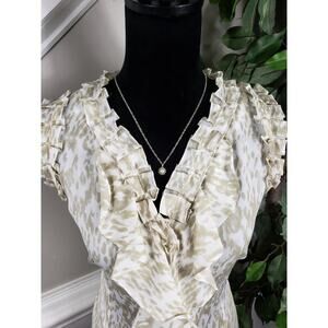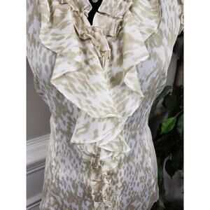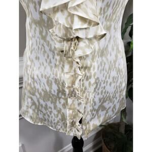 AK Anne Klein Blouse Women 12 Tan White 100% Polyester Ruffle Sleeveless V-Neck