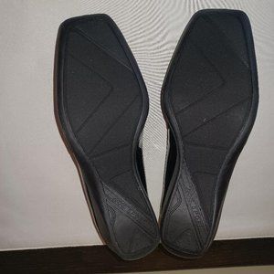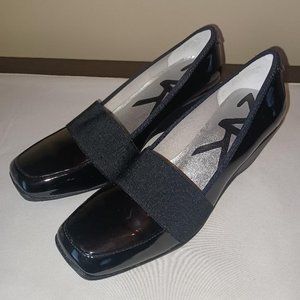 Black patent leather wedge shoes with nylon strap on top of shoe. 2" wedge heel