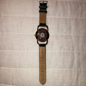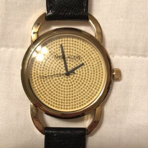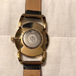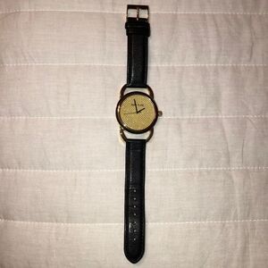 AK Gold Tone Rhinestone Wrist Watch Black Genuine Leather Strap