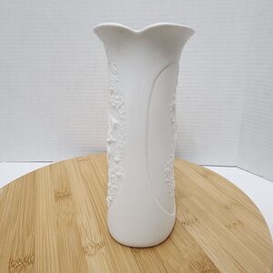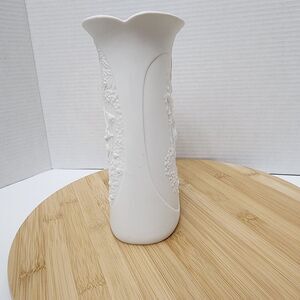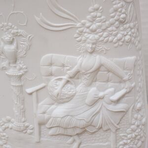 This elegant bisque porcelain vase from AK Kaiser features a romantic pastoral scene of a lady in a gown sitting on a bench under a tree with a basket. The intricate details are enhanced with raised relief and a 3D effect. The vase has a matte interior and a glossy glazed interior, and it measures approximately 8.5" in height and 5 1/4" in width. It is signed by the artist M. Frey and is a beautiful addition to any collection or decor.
