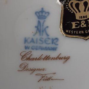 This AK Kaiser 6" vase features yellow roses front and back. It flares at the top and is trimmed in gold along the upper and lower rims and also approx. 1" above the bottom. This piece was made in W. Germany and the mark indicates the designer ... looks like Tiettam (?). The numbers "794/2" are imprinted on the bottom. There is also a Golden Crown E&R sticker on the bottom.