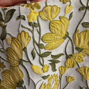 Beautiful floral embroidered fabric by AK Skylan. Features vibrant yellow flowers on a gray background.