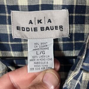 AKA Eddie Bauer Button Up Shirt Men's Large Blue Plaid Long Sleeve 100% Linen