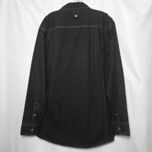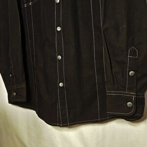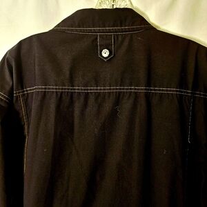 AK:CESS | Mens Black metal button-up long sleeve Shirt with just the right amount of contrast stitching | Premium Quality | Decorative straps on shoulders, front pockets, and back of neck | Excellent pre-loved condition with minor fading on the inside only of back collar (barely visible in last photo) | Size 2X