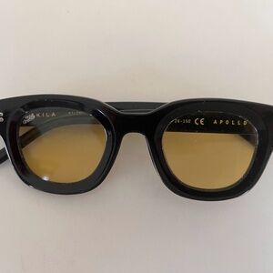 AKILA "Apollo" sunglasses in excellent condition. Black acetate frame with yellow lenses-no scratches on the lenses or outer frame. Only very light hairline marks on the inside of the arms (not visible when worn). 46-26-150 (Medium fit), looks great on most face shapes, not oversized. Clean and polished. Not in the original case, but I will include a protective case. Smoke-free home.