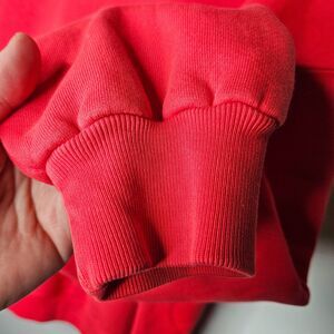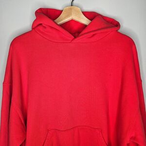 AKIMBO Club Hoodie Sweatshirt. Strawberry Red. Size Small. Oversized. Organic Cotton. Heavyweight Cotton. Boxy. Kangaroo Pocket. Excellent condition with one tiny, almost indiscernible, spot on the front (see photo 3). Chest approximately 25 inches pit to pit. Length approximately 24 inches.