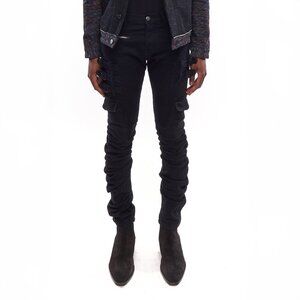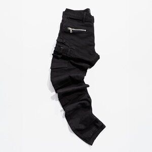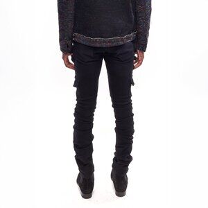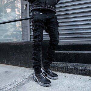 Crafted using an organic stretch denim and designed with our signature J-shape silhouette, Black Omari Stacked Jeans are one of the most comfortable jeans in the Omari lineup and our top three picks for versatility when styling with other tops and shoe options. These stacked jeans come equipped with adjustable buckled straps and two discrete cargo pockets making them all around functional slim cargo pants. Find a coin pocket with an AK branded zipper for storing cash.
