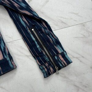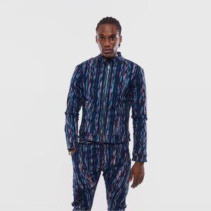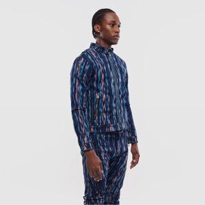Hisoka Jacket is a representation of biker meets high-end fashion. Crafted in an organic stretch denim, the piece is finished with multi-color brush stroke patterns and two zipped front pockets.