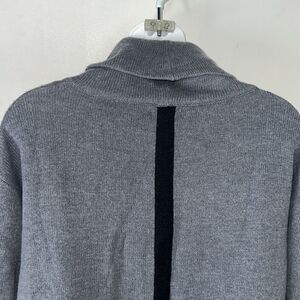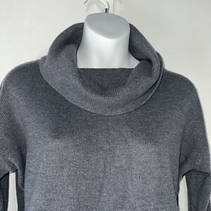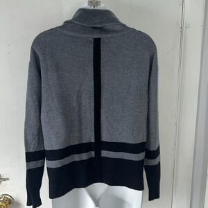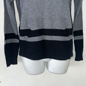 Gray with black stripe viscose, nylon, lambswool, cashmere blend, with ribbed, ham, cuffs and cow neck collar. Kangaroo pocket detail on the front. Washable. Size small measures 23” from armpit to armpit and 24” from top of shoulder to bottom hem. Excellent condition.