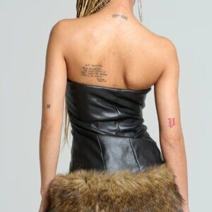 Another day, another slay in The AKIRA Label Baron PU Mini Dress With Fur Trim. This sassy dress is crafted from a non-stretch, faux leather base and features a strapless neckline with inner elastic trim for added support, a paneled construction, a sleek inner lining, and luxurious fur trim detailing on the bottom hem. Complete with a tonal side zipper closure, a bodycon fit, and a mini length. Pair with lace-up stiletto boots and a smokey eye for a finished look.