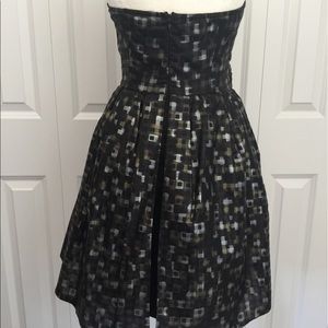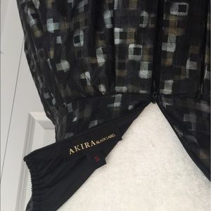 Cocktail dress with two layers. Top layer is printed with brushes of silver and gold and bottom layer is matte black. Front has an open fold showing second layer. Second layer shows out the bottom of Dress. Back skirt is a bit longer than the front.
