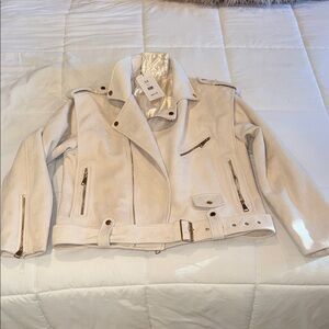 Stylish cream faux suede jacket with zipper details. Features a belted waist and sleek design. Ideal for a modern look. NWT